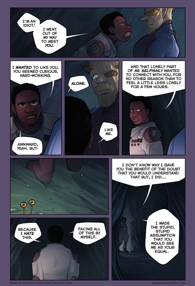 Something about this is so satisfying. I love how both of their characters are written, but Bex finally being able to say this stuff to Mike feels like a well deserved and contextually sound pay-off, instead of just conflict needlessly pumped in to “flesh them out”, if that even makes sense?? I just love this comic woops. Also congrats on the Electrum stuff, it’s great to see you doing great!! :D